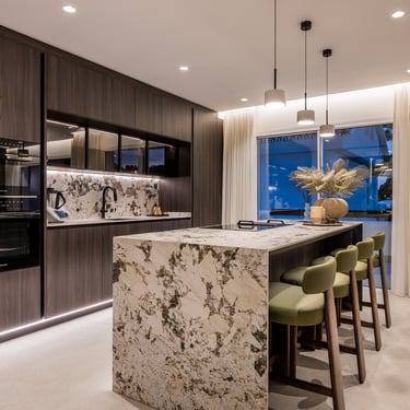 Step inside to discover meticulously designed living spaces that exude luxury. The open-plan layout features elegant flooring, bespoke furnishings, and an array of premium materials, including natural fabrics that enhance its refined aesthetic. The state-of-the-art kitchen, equipped with high-end German appliances, is a culinary masterpiece. Luxurious details such as custom wardrobes, underfloor heating, an electric fireplace, and a Bang & Olufsen sound system ensure an exceptional living experience, while expansive windows flood the interiors with natural light and frame spectacular views.